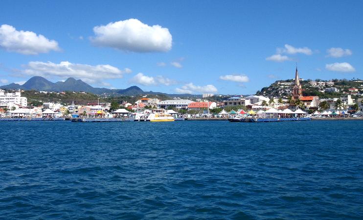 from our boat of the waterfront of Fort-de-France with the Pitons du Carbet in the background.